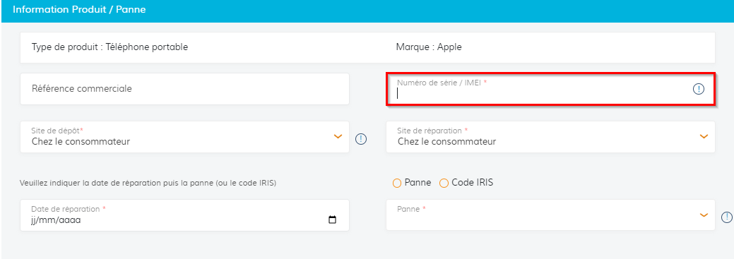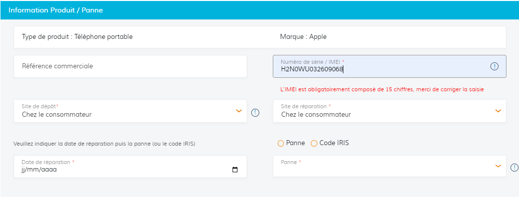 Veuillez entrer le code IMEI, qui comporte 15 chiffres, dans le champ réservé au numéro de série :